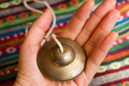 Close-up of a womans hand holding Tibetan bells for sound therapy. Tibetan cymbals