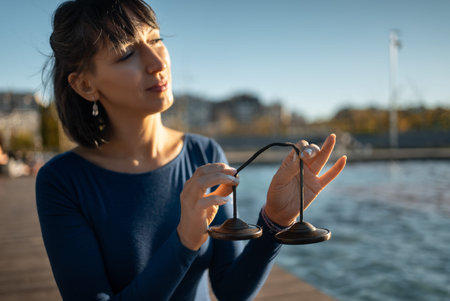 person holding tibetian tingsha bell instrument for vibration and sound healing therapy, ting-sha cymball body and mind recovery technique, woman meditation and spirituality concept