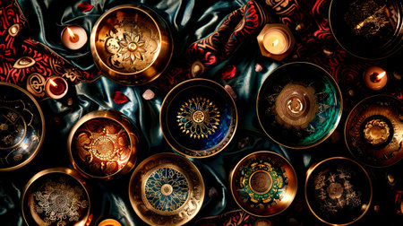 A stunning assortment of Tibetan singing bowls is arranged on soft, colorful fabric. Candles and rose petals enhance the atmosphere of tranquility and harmony.