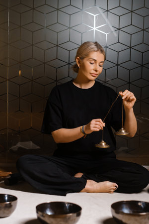 beautiful woman playng on tibetan bowl. Woman on music therapy. ceremonial space.