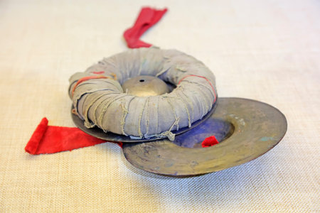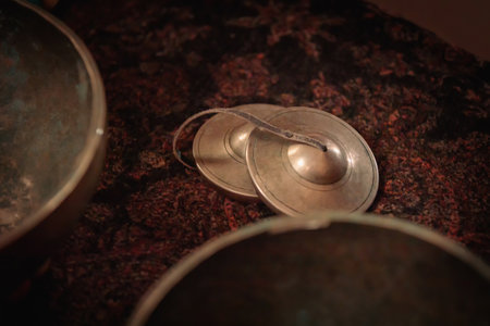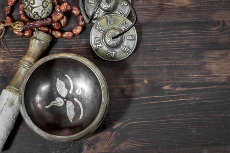 Tibetan tigsha cymbals with sound bowls. The concept of Tibetan rituals, meditations and sound therapy.