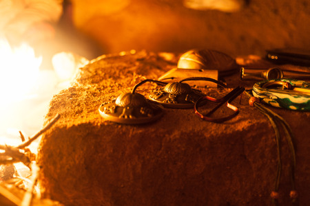 Traditional engraved metal plates on a vibrant patterned fabric.