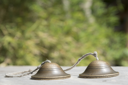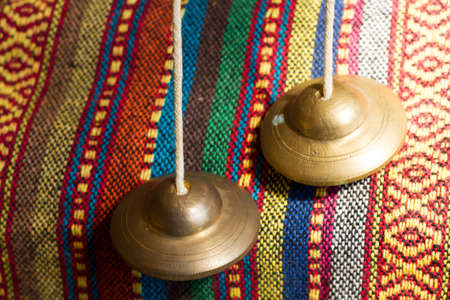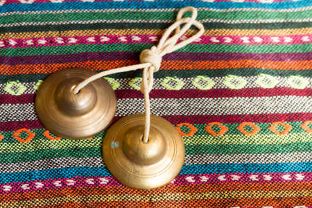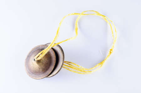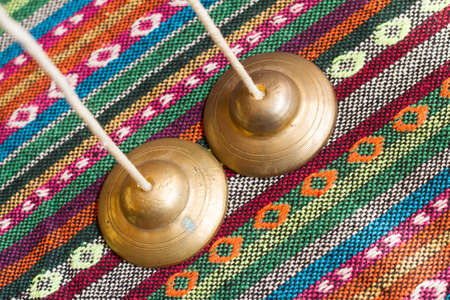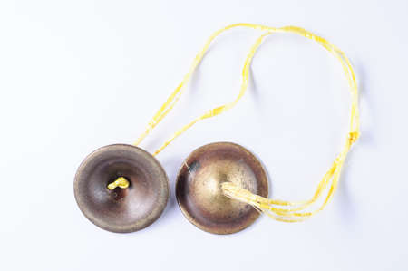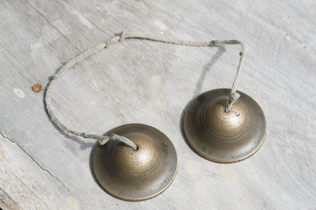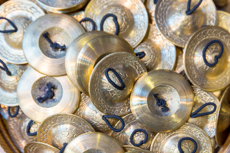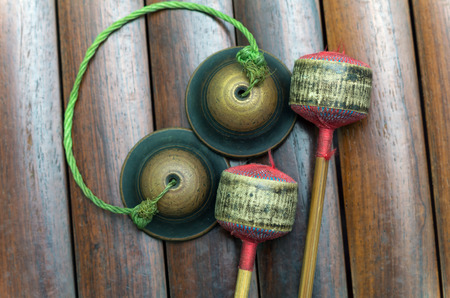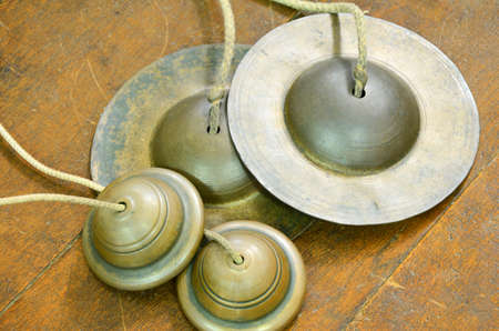 Ronze cymbals castanets Thai asian music percussion instrument on wooden background.