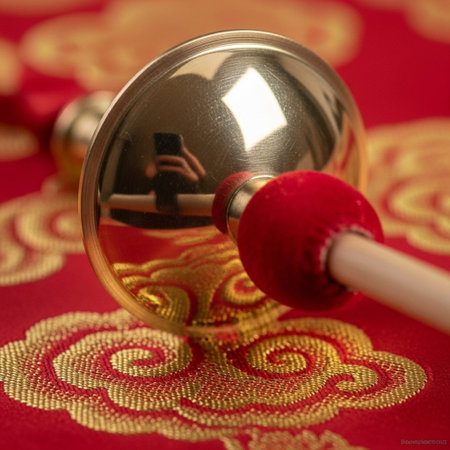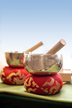 Two singing bowls or standing bells on red cushions with golden embroidery, used for music, meditation and relaxation or for personal spirituality, copy space, selected focus, narrow depth of field