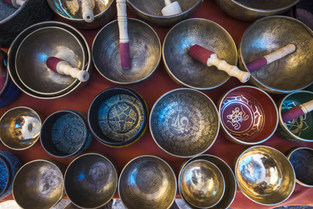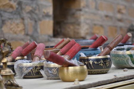 Tibetan Buddhist singing bowls on the market in Leh town, India. TRANSLATION from Tibetan language: Pearl in the lotus flower, Ladakh, India