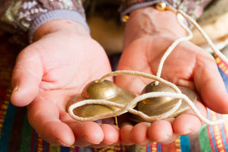 adult man in black clothes holds in his hands a pair of bronze Karatal on a leather rope, object for religious rituals, meditations and alternative medicine, low key