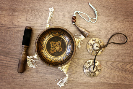 Ancient hand crafted traditional Tibetan meditation and healing singing bowls made from 7 sacred metals which are typical accessories used in buddhism, yoga and meditation, against a red brick wall