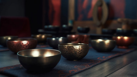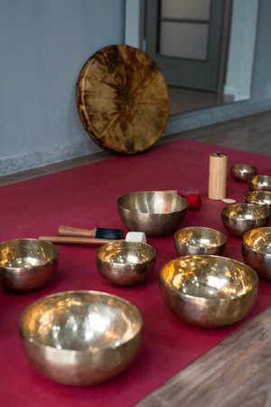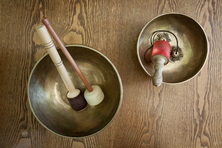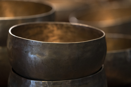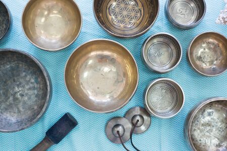 tibetian singing bowls, view from above; asian copper music instruments for relaxation;