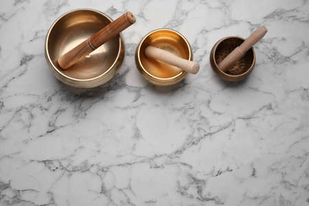 Golden singing bowls with mallets on white marble table, flat lay. Space for text