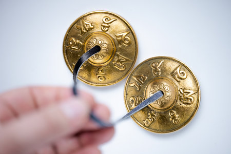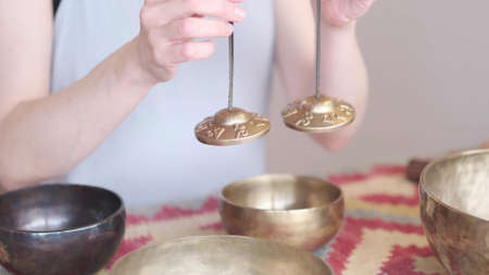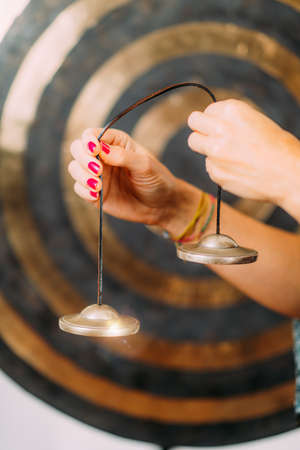 person holding tibetian tingsha bell instrument for vibration and sound healing therapy, ting-sha cymball body and mind recovery technique, woman meditation and spirituality concept