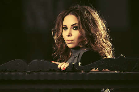 Young fashion woman sitting on bench in night city street Stylish female model with long wavy hairs