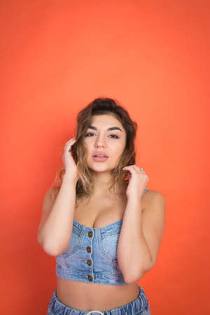 Studio fashion shooting. The girl in a bright outfit, top and pants flared in red and orange colors. Brunette with curly hair . Close-up portrait. Fingers around the lips