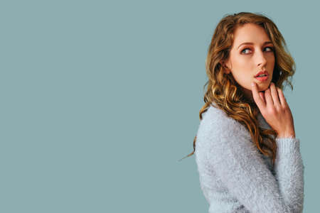 Attractive woman wavy hair charming look cosmetics elegant style blue background