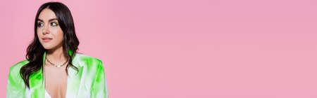 Brunette woman in stylish jacket looking away isolated on pink, banner