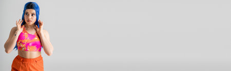 modern individual, tattooed young woman with blue hair posing with hands near face on grey background, modern style, urban fashion, vibrant color, female model, looking away, banner