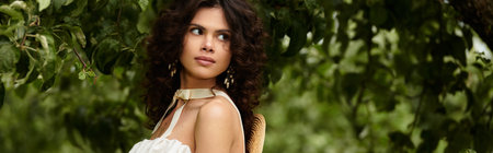 A beautiful young woman in a white summer dress relaxes in a vibrant green park, banner