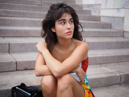 Beautiful brunette woman in stylish casual clothing jeans and sneakers sitting on floor touching curly hair looking aside