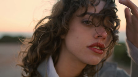 Portrait pretty girl look camera at blurred evening sky. Romantic woman adjust touching curly hair waving in wind. Serene beautiful female enjoying quiet place posing on sunset. Weekend leisure travel