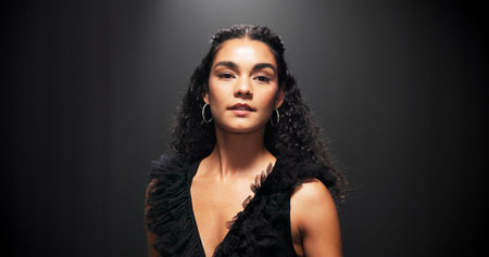Young woman with long hair in black outfit, looking confidently, showcasing beauty and elegance, perfect for fashion or portrait photography.