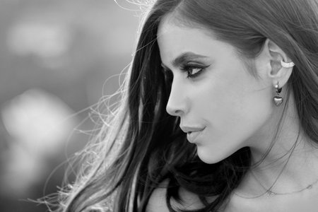 Fashion model. Beautiful woman with clean fresh skin. Stylish accessories. Fashionable jewelry, earrings. Fashion wear. Beauty trends. Fashion woman with jewelry. Beautiful woman with fashion make-up