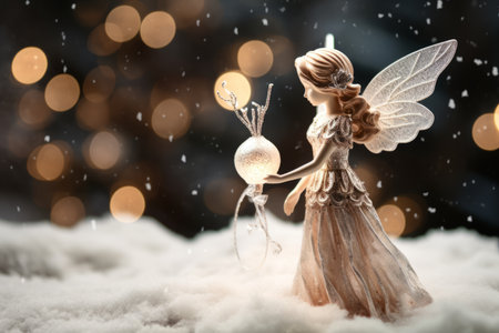 An Exquisite Angel Ornament with Detailed Wings Reflecting the Warm Christmas Lights on a Wintry Night