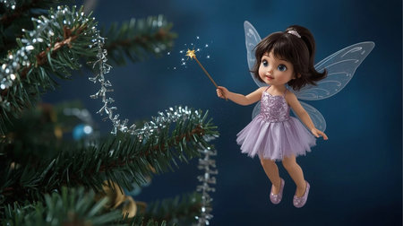 A small, cheerful fairy with blue eyes and dark hair above the a Christmas tree branch.