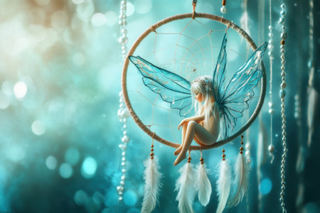 Pretty fairy sitting on dream catcher with turquoise bokeh background