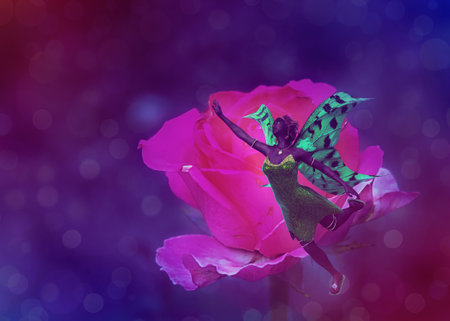 Bright pink rose and 3D fantasy fairy girl, photomanipulation.