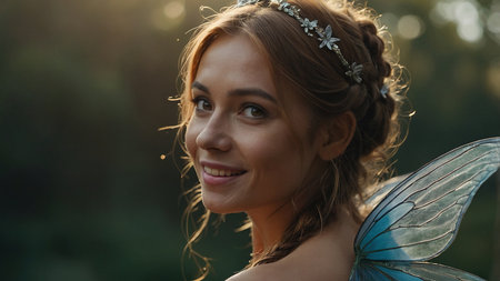 Enchanted Forest Fairy With Delicate Wings and Flower Crown Smiling Beautifully in the Soft Morning Light.