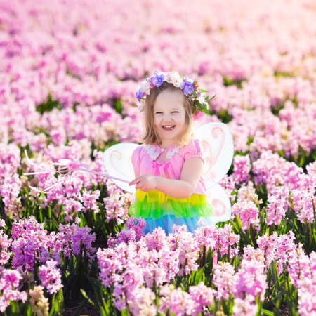 Beautiful girl playing in blooming hyacinth flower field. Kids princess birthday party with fairy costume, butterfly wings and magic wand. Children play in spring flowers. Child picking hyacinths.