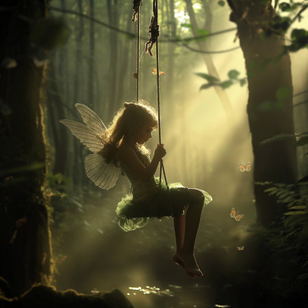 Flying fairy with blonde hair and butterfly wings Swinging on a swing in a mysterious forest.