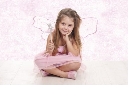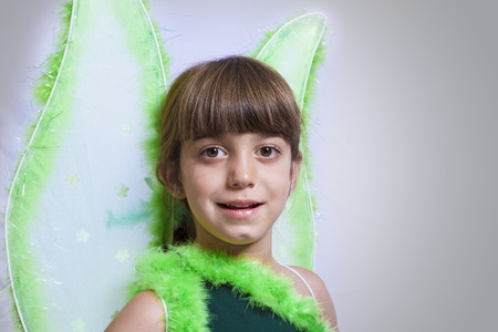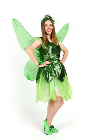 A young girl dressed as a forest fairy with wings in the studio on a white background.