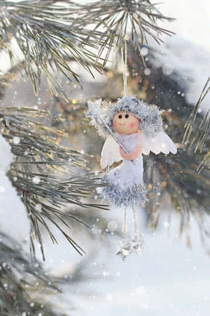 Christmas angel (little fairy) on a background of winter trees among snowflakes.