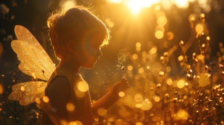 This enchanting image captures a little girl with delicate fairy wings in a golden sunset field, embodying the magic and innocence of childhood in a serene setting.