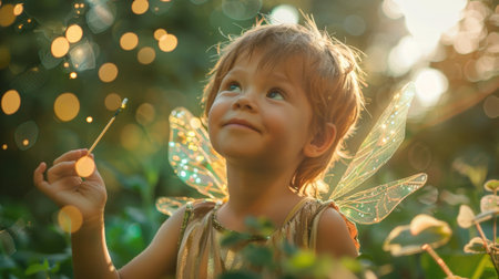 A boy in a fairy costume, complete with wings and a magic wand, exploring a garden and making 'magic' happen .