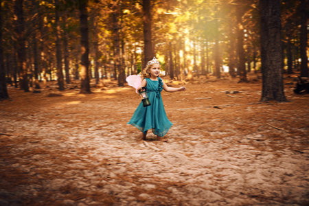 A little girl in a fairy costume, standing in an enchanted forest with sparkling lights and magical surroundings.