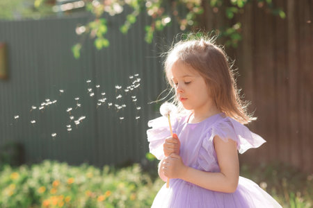 Happy beautiful girl blowing on a dandelion on a sunny summer evening. A child in the fresh air, in nature. The setting sun.