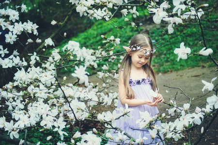 fairy tale girl. Portrait of mystic elf child. Cosplay character. Portrait of an elf in a blooming garden. A girl with long ears touches