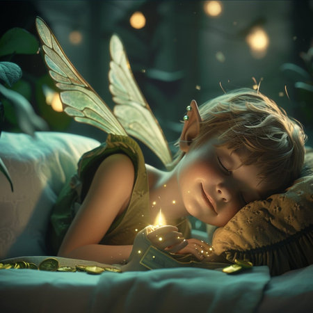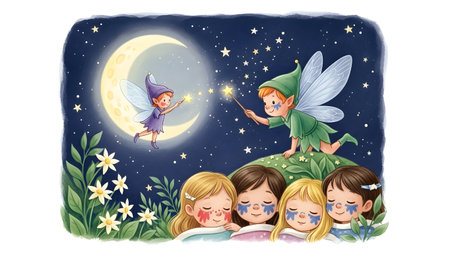 Two fairies create starry dreams for sleeping children under a moonlit night sky. Clear details a...