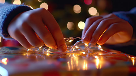 Close-up of hands playing with fairy lights, with reflections on a shiny Christmas gift wrap in the background