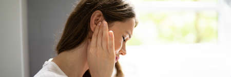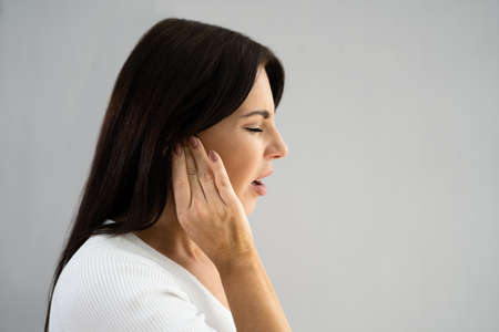Earache And Pain. Unhappy Woman With Otitis Externa