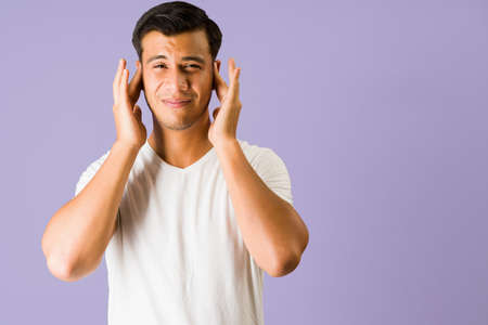 Stop, I don't want to hear. Stressed young man bothered by the loud noise and covering his ears