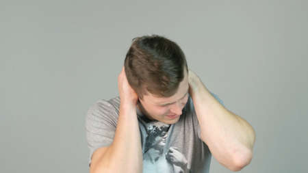 young, angry, unhappy, stressed man covering his ears, to say, stop making loud noise its giving headache, grey background