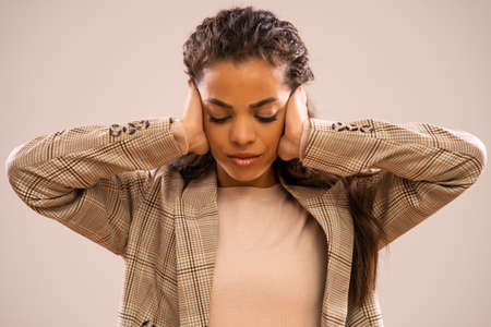 Portrait Of Unhappy Displeased African American Woman Covering Ears With Fingers