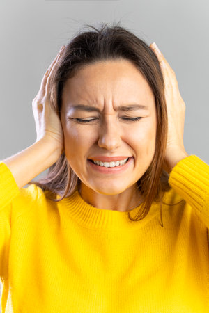 Woman covered her ears with hands, have strong headache, exhausted and stressed person in depression