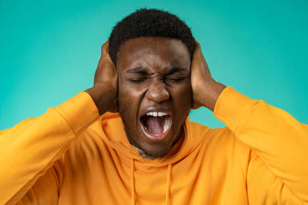 Portrait of man who is tired and exhausted. He is covering his ears.