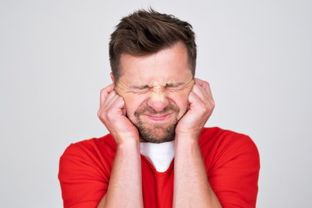 Caucasian man holds his hands over his ears not to hear.