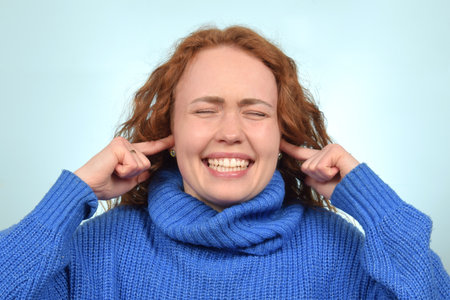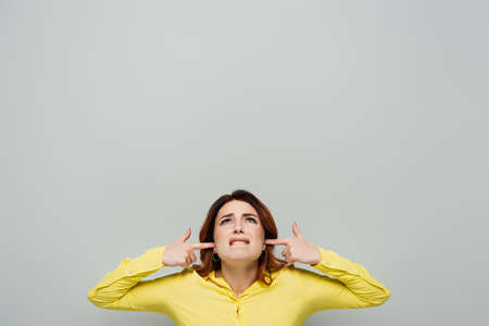 dissatisfied woman looking up while plugging ears on gray