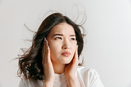 a sad, very upset woman holds her hand near her ear, listening and looking at the camera with a puzzled expression on her face. Close, Horizontal, studio photography