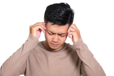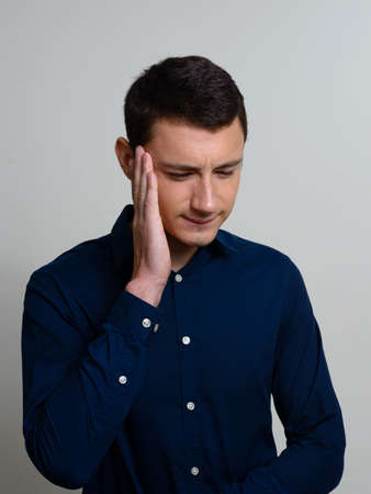 young man having ear pain touching his painful ear ,